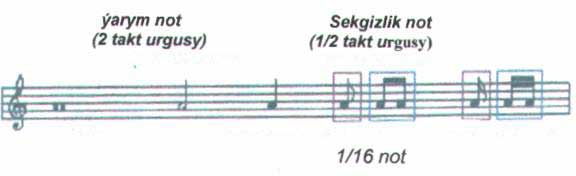 Sekgizden bir notlaryň kakuwsy ½ takurga deňdir.S