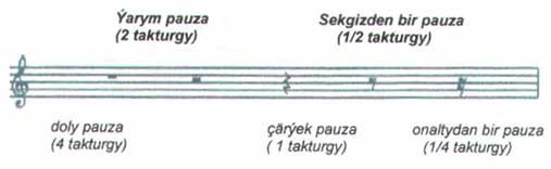 Saz bölümniň içinde noty çalynmany, ýöne ses-syz zamanyň ölçegi hasabynda Şol saz bölüminde bolup gelýän belliklere Pauza diýilýär.Diýmek pauza:sesleriň arasyndaky dym-dyrsykly ölçegi bolup ,şol sazyň bir böleg hasabyna girýär. Pauzalariň edil not görnüşleri ýaly dürli-dürli ölçegleri bar.bir pauzaň dowamlygy , berilen takturgylaryň sanyna, we taktgörnüşine bagly we çalmaly tempoa , şertlidir.